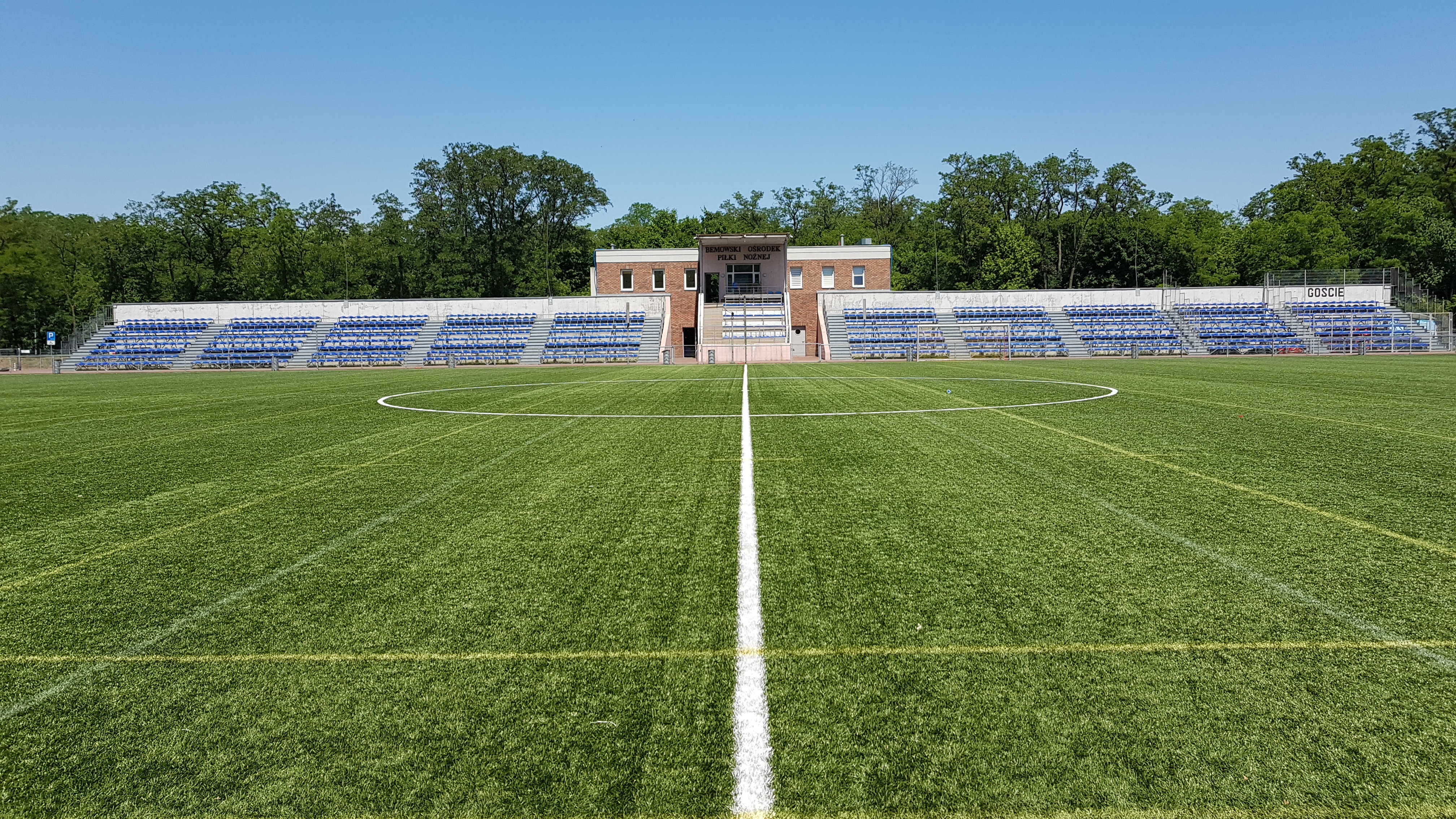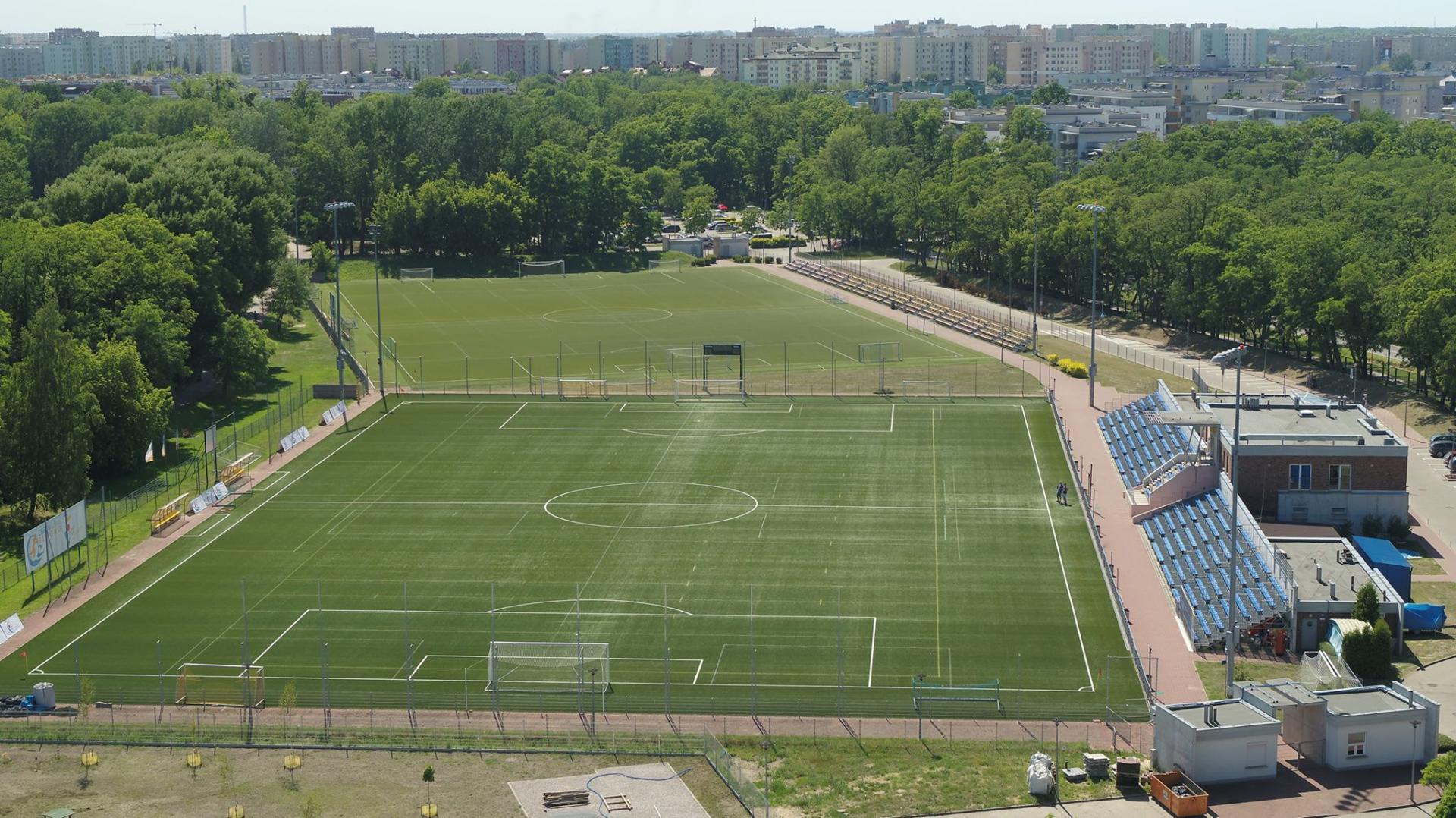 Zmodernizowane, pełnowymiarowe boisko piłkarskie ze sztuczną nawierzchnią i trybunami na 980 osób spełnia aktualnie najwyższe, światowej klasy standardy, które zostały potwierdzone przez specjalistyczne laboratorium FIFA i dzięki temu uzyskało certyfikat FIFA Quality PRO. Jest to najwyższy certyfikat wydawany przez FIFA dla pełnowymiarowych boisk z traw syntetycznych. W grudniu 2016 zainstalowano nowoczesny system zraszania, który w razie upałów będzie do naszej dyspozycji! Na terenie ośrodka znajduje się 300 miejsc parkingowych oraz kompleks 10 szatni z prysznicami,